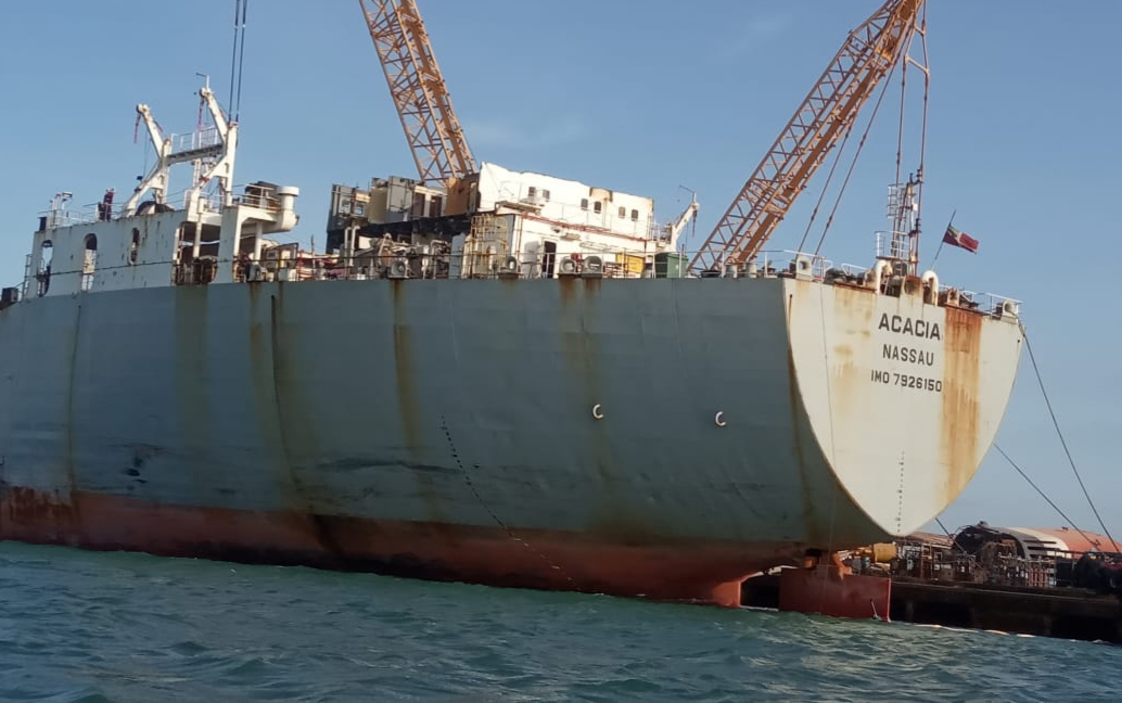 “Ini dia kapalnya,” kata nelayan yang mengantar HMS. Kemudian, dia membawa kami mendekat ke kapal tipe kargo dengan nama lambung Acacia Nassau, berbendera Bahama, yang badan kapalnya hanya bersisa separuh dengan panjang sekitar 80 meter itu. Dari bawah, terlihat percikan api yang bersumber dari aktivitas sejumlah pekerja di atas kapal sedang memotong-motong bagian kapal. Perairan di sekitarnya terlihat keruh dan sesekali menyembulkan buih.
