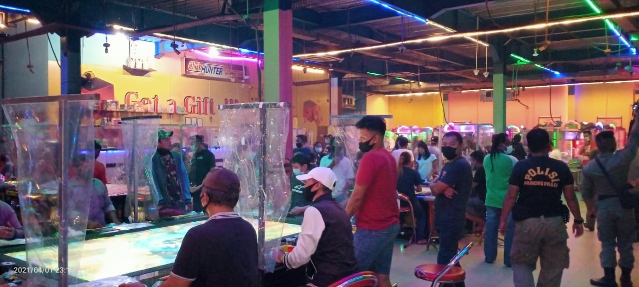 Petugas gabungan melakukan patroli pengawasan dan penegakan perizinan ke sembilan gelanggang permainan di Kota Batam, Kepulauan Riau, Kamis, 1 April 2021. Hasilnya, tujuh lokasi didapati dalam keadaan sepi, sementara dua lainnya yang kebetulan sedang ramai pengunjung kepergok personel tidak mematuhi protokol kesehatan.